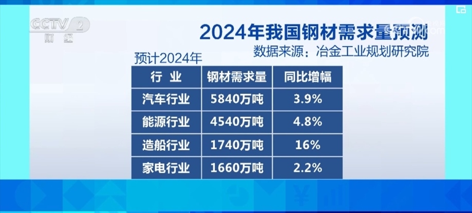 根據(jù)冶金工業(yè)規(guī)劃研究院的綜合預(yù)測,2024年,我國鋼材需求量為8.75億噸。從下游行業(yè)消費(fèi)來看,預(yù)計2024年,汽車行業(yè)的鋼材需求為5840萬噸,同比增長3.9%;能源行業(yè)的鋼材需求為4540萬噸,同比增長4.8%;造船行業(yè)的鋼材需求為1740萬噸,同比增長16%;家電行業(yè)的鋼材需求為1660萬噸,同比增長2.2%。