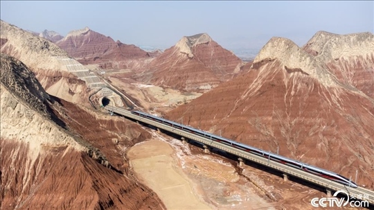 2024年3月3日,蘭州紅古區(qū)的七彩丹霞中,疾馳在蘭新高鐵上的動車組列車從中穿越,中國速度與錦繡山河完美同框,格外壯美。