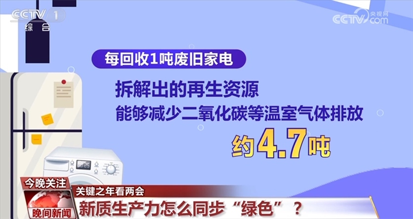 數(shù)據(jù)顯示,2023年,冰箱、洗衣機、空調(diào)等主要品類家電保有量超過30億臺,一些家電使用了十多年、二十年,更新?lián)Q代的需求和潛力很大。據(jù)統(tǒng)計,2023年,我國廢舊家電回收總量達450萬噸,而每回收1噸廢舊家電,拆解出的再生資源能夠減少二氧化碳等溫室氣體排放約4.7噸。