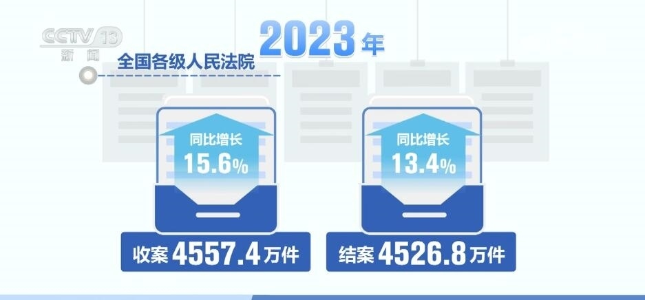 最高人民法院收案21081件,結(jié)案17855 件。同比分別增長(zhǎng)54.6%、29.5%。全國(guó)各級(jí)人民法院收案4557.4萬(wàn)件,結(jié)案4526.8萬(wàn)件,同比分別增長(zhǎng)15.6%、13.4%。