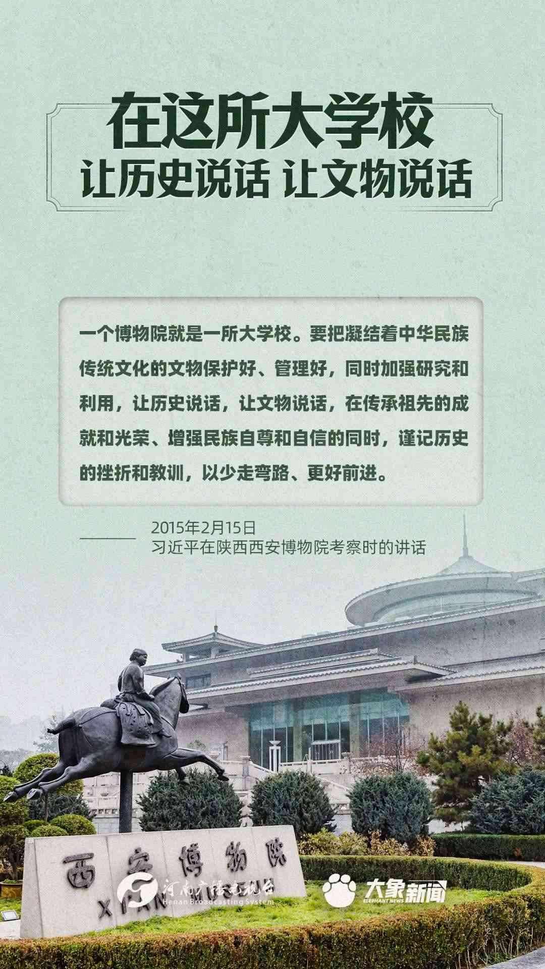 習(xí)近平總書記一直高度重視博物館工作,多次作出重要講話,強(qiáng)調(diào)“一個(gè)博物院就是一所大學(xué)校”,指出“讓歷史說話,讓文物說話”,要求“守護(hù)好、傳承好、展示好中華文明優(yōu)秀成果”等等,金句連連。大象新聞進(jìn)行了認(rèn)真梳理,邀您一起學(xué)習(xí)。