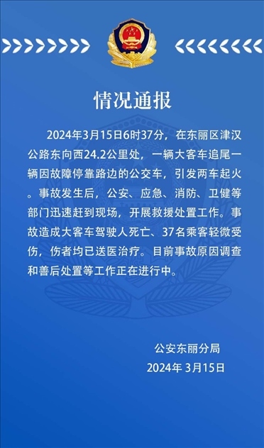 ·天津一輛大客車追尾一輛因故障停靠路邊的公交車,引發(fā)兩車起火,事故造成大客車駕駛?cè)怂劳觥?7名乘客輕微受傷。