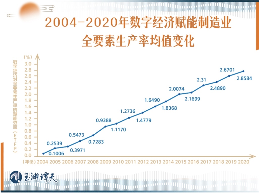 有學(xué)者做過測算,從2004年開始到2021年,數(shù)字經(jīng)濟(jì)賦能制造業(yè)全要素生產(chǎn)率效能呈逐年上升的趨勢,且近年來,賦能均值達(dá)到了最高點(diǎn)。
