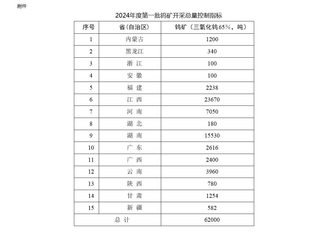 央視網(wǎng)消息:據(jù)自然資源部消息,自然資源部發(fā)布關于下達2024年度鎢礦開采總量控制指標(第一批)的通知,2024年度第一批鎢礦(三氧化鎢含量65%,下同)開采總量控制指標62000噸。鎢礦開采總量控制指標不再區(qū)分主采指標和綜合利用指標。對采礦許可證登記開采主礦種為其他礦種、共伴生鎢礦的礦山,查明鎢資源量為大中型的,繼續(xù)下達開采總量控制指標,并在分配上予以傾斜。對共伴生鎢資源量為小型的,不再下達開采總量控制指標,由礦山企業(yè)向所在地省級自然資源主管部門報備鎢礦產(chǎn)量。具體如下: