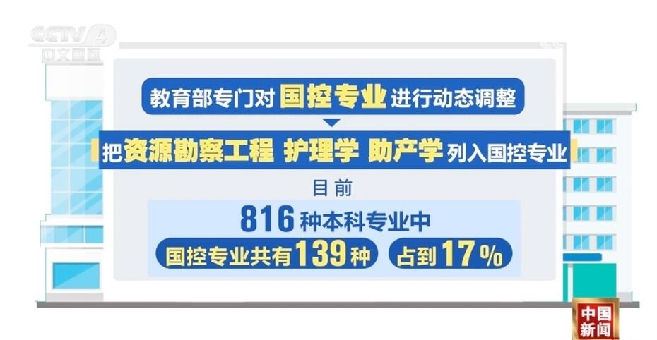 此次教育部專門(mén)對(duì)國(guó)控專業(yè)進(jìn)行了動(dòng)態(tài)調(diào)整,把資源勘察工程、護(hù)理學(xué)、助產(chǎn)學(xué)列入了國(guó)控專業(yè)。目前,816種本科專業(yè)中,國(guó)控專業(yè)共有139種,占到17%。未來(lái),國(guó)控專業(yè)范圍還將進(jìn)行“有進(jìn)有出”的動(dòng)態(tài)調(diào)整。