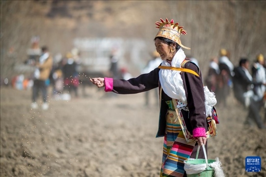 3月16日,在西藏山南市瓊結(jié)縣加麻鄉(xiāng)加麻村的春耕儀式現(xiàn)場(chǎng),農(nóng)民播撒種子。新華社記者 旦增尼瑪曲珠 攝