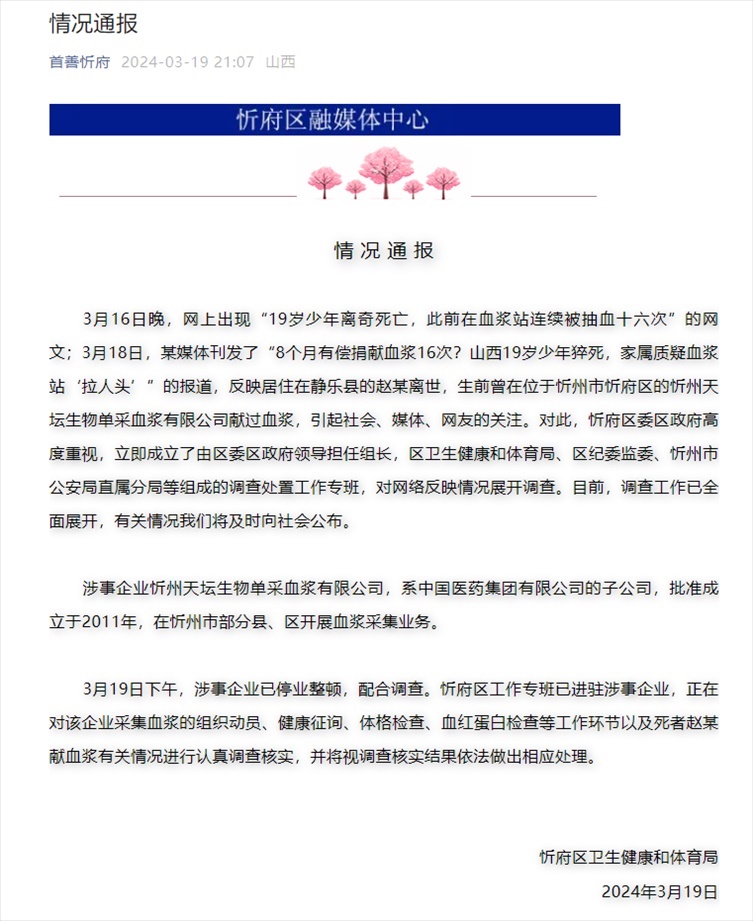 ·山西忻州通報(bào)“19歲少年生前被連續(xù)抽血16次”:已展開(kāi)調(diào)查。
