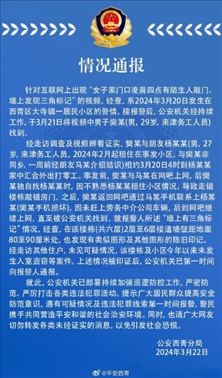 ·天津警方通報網(wǎng)傳“女子家門口發(fā)現(xiàn)三角標(biāo)記”。