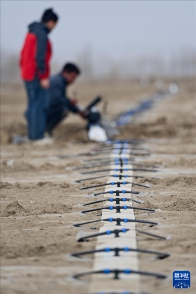 在新疆阿克蘇地區(qū)阿瓦提縣高標(biāo)準(zhǔn)農(nóng)田核心示范區(qū),農(nóng)業(yè)技術(shù)員在調(diào)試水肥一體化灌溉系統(tǒng)(3月27日攝)。