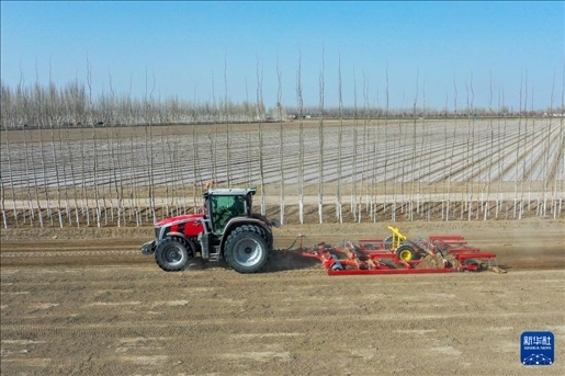 在新疆阿克蘇地區(qū)阿瓦提縣阿依巴格鎮(zhèn)幸福村,精量播種機(jī)在棉田春播(3月26日攝)。