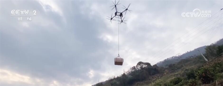 在湖北宜昌興山縣秀龍村,眼下的橙子采收也用上了新工具。裝有鉤子的無(wú)人機(jī)飛到柑橘地上空,村民用鉤子勾住裝有100斤鮮橙的筐子。隨后,無(wú)人機(jī)就將這些鮮橙運(yùn)到了公路邊的貨車上。這樣的無(wú)人機(jī)一天可以運(yùn)輸3萬(wàn)斤橙子,完成了超過16人的工作量,節(jié)約了2500元以上的成本。