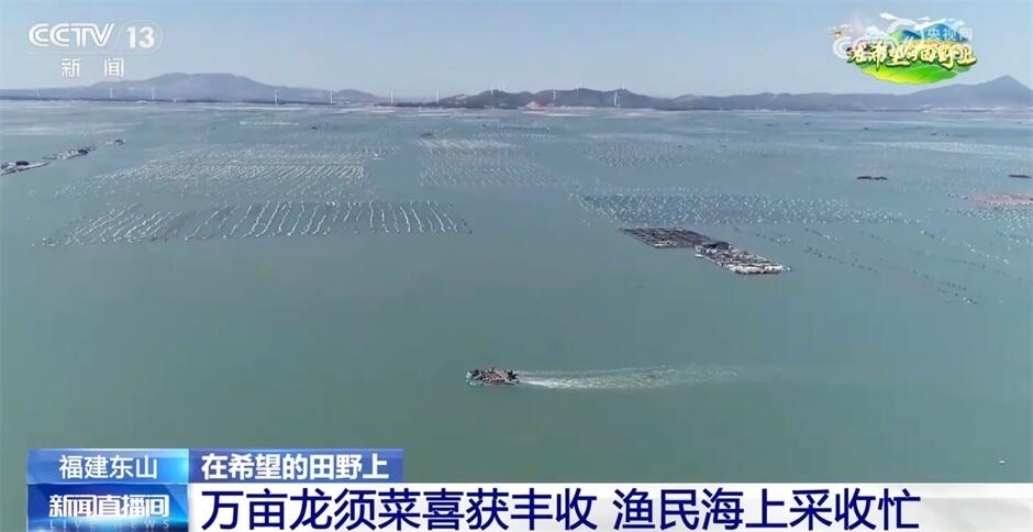 跟隨鏡頭,我們來到豐收的“海上菜田”。在福建漳州東山縣海域,兩萬多畝龍須菜迎來了采收旺季。從空中看去,“龍須菜田”一塊塊排列整齊。漁船穿梭在“海上菜田”中,漁民們接替收割、搬運(yùn)龍須菜。