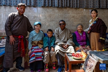 白瑪老人(左四)在家中與家人合影(3月27日攝)。新華社記者 姜帆 攝