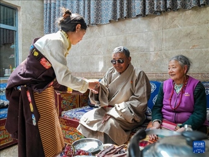?白瑪?shù)膶O女嘎桑玉珍(左)為他和老伴多吉卓瑪敬酥油茶(3月27日攝)。新華社記者 丁汀 攝