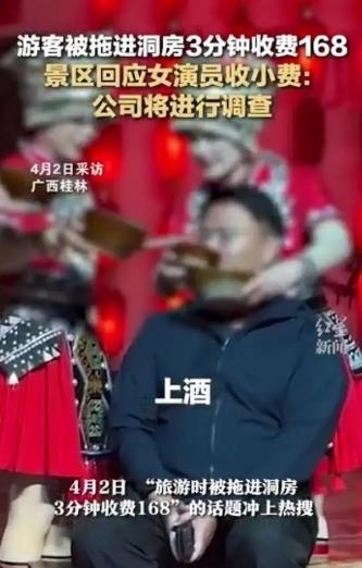 ·游客被拖進(jìn)洞房3分鐘收費(fèi)168元,景區(qū)回應(yīng):系女演員收小費(fèi)。廣西陽朔文旅部門介入調(diào)查。