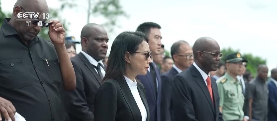 中國駐坦桑尼亞大使陳明健和坦桑尼亞工程和交通部長姆巴拉瓦走上公墓石階,整理挽聯(lián)、鞠躬致敬,全體人員默哀并三鞠躬,緬懷長眠于此的中國援建坦贊鐵路和其他援坦項目的專家。