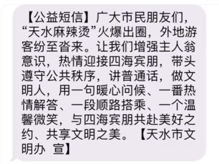 事實(shí)上,自3月以來天水在網(wǎng)絡(luò)“出圈”后,游客就絡(luò)繹不絕。有多位當(dāng)?shù)鼐W(wǎng)友“曬”的消息顯示,3月20日收到天水市發(fā)布的“公益短信”,建議當(dāng)?shù)厥忻瘛霸鰪?qiáng)主人翁意識(shí),熱情迎接四海賓朋……用一句暖心問候、一番熱情解答、一段順路搭乘、一個(gè)溫馨微笑,與四海賓朋共赴美好之約……”