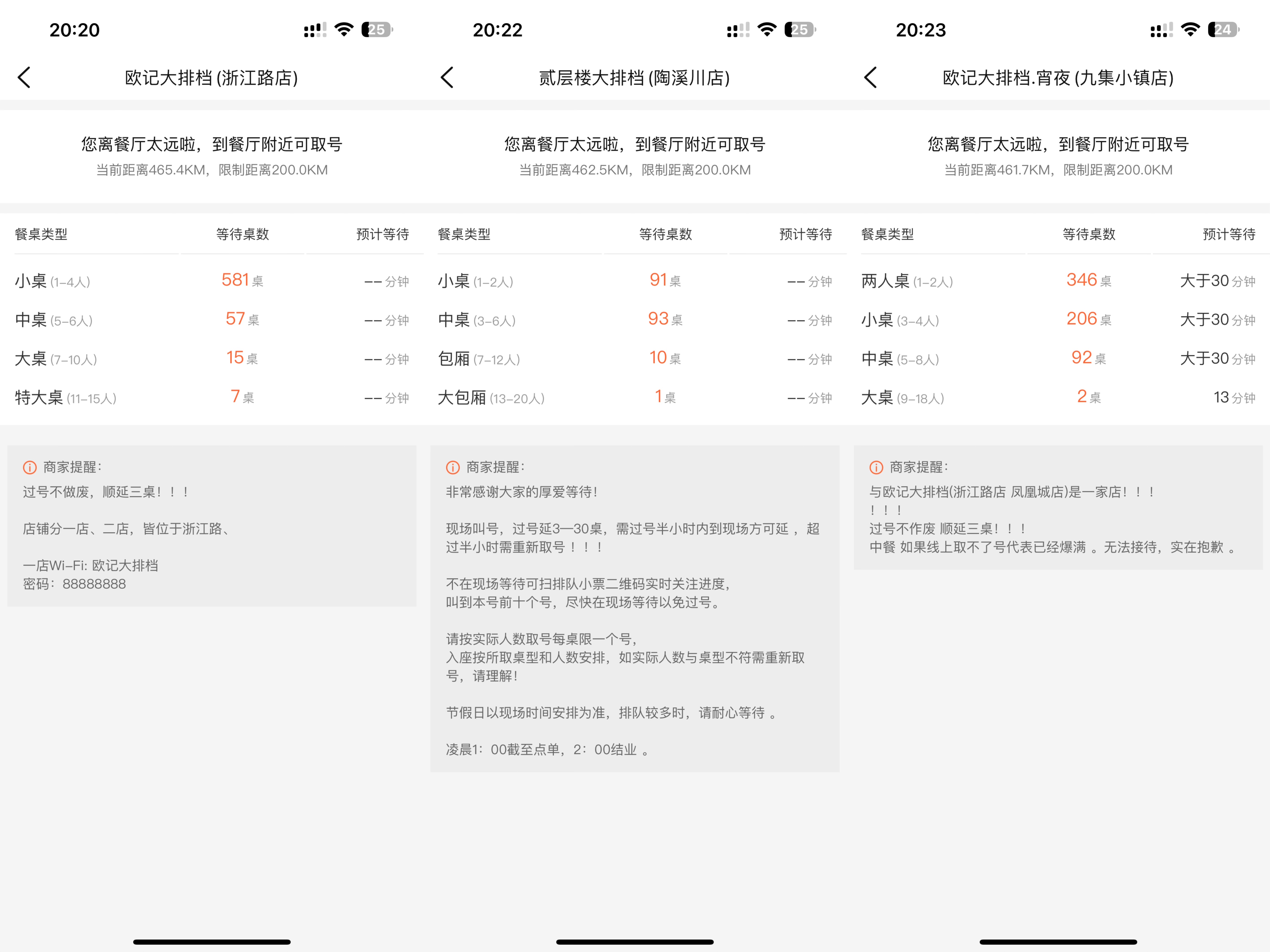 4月4日晚,澎湃新聞在大眾點(diǎn)評(píng)上搜索發(fā)現(xiàn),景德鎮(zhèn)多家餐廳爆滿。如截至當(dāng)日20:20,歐記大排檔浙江路店的小桌需等待581桌,中桌需等待57桌。截至當(dāng)日20:22,貳層樓大排檔陶溪川店的小桌需等待91桌,中桌需等待93桌。截至當(dāng)日20:23,歐記大排檔九集小鎮(zhèn)店的兩人桌需等待346桌,小桌需等待206桌,中桌需等待92桌。