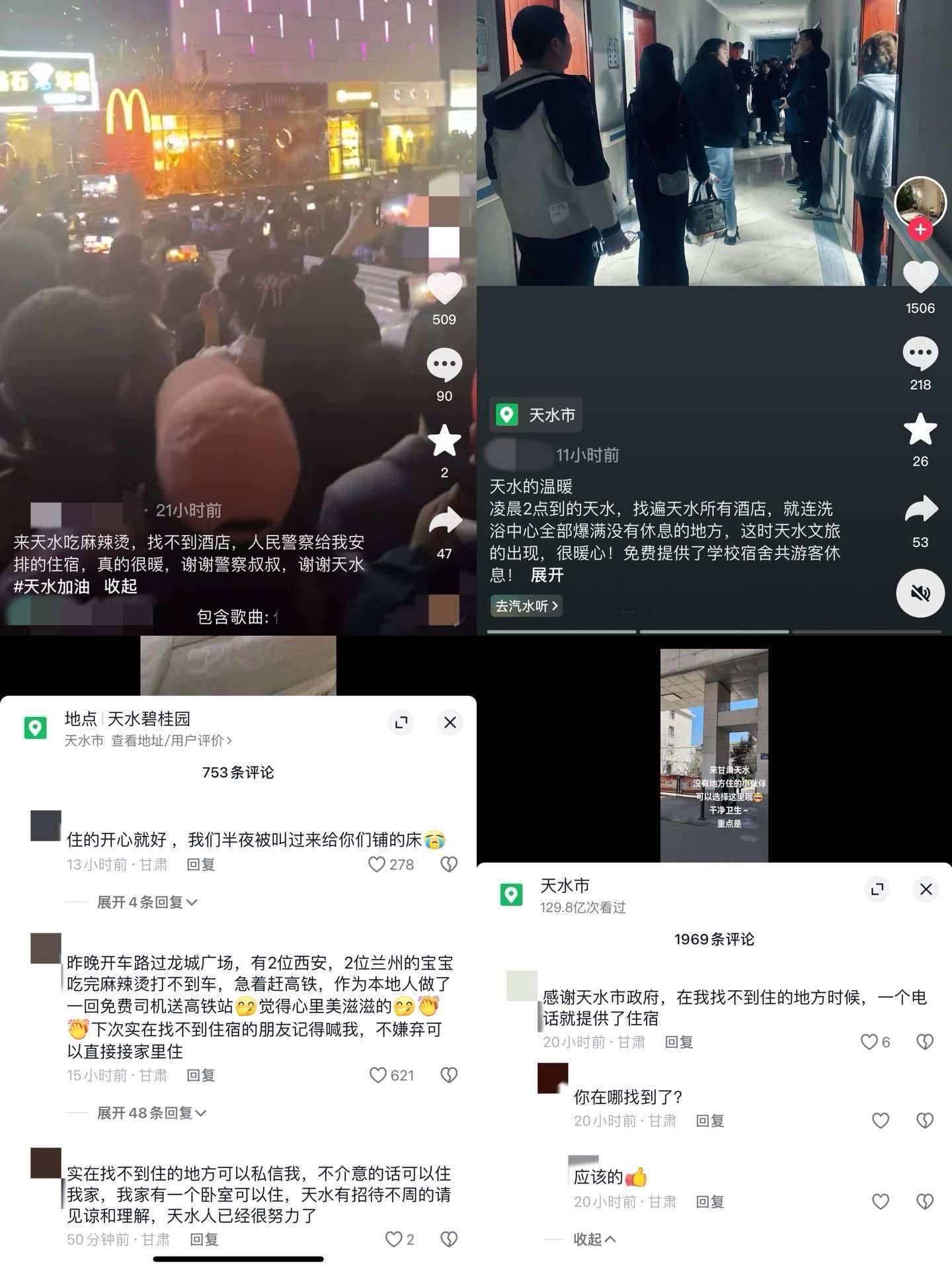在社交平臺(tái)上,不少網(wǎng)友發(fā)布了找不到住宿而被幫助的內(nèi)容,紛紛表示“感謝天水”。