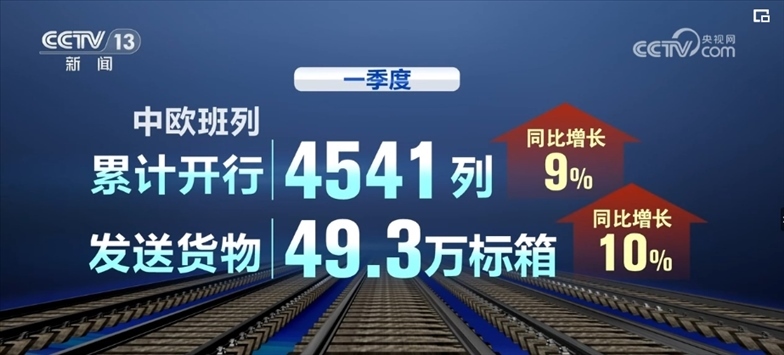 數(shù)據(jù)顯示,一季度中,歐班列累計(jì)開行4541列,發(fā)送貨物49.3萬(wàn)標(biāo)箱,同比分別增長(zhǎng)9%、10%。