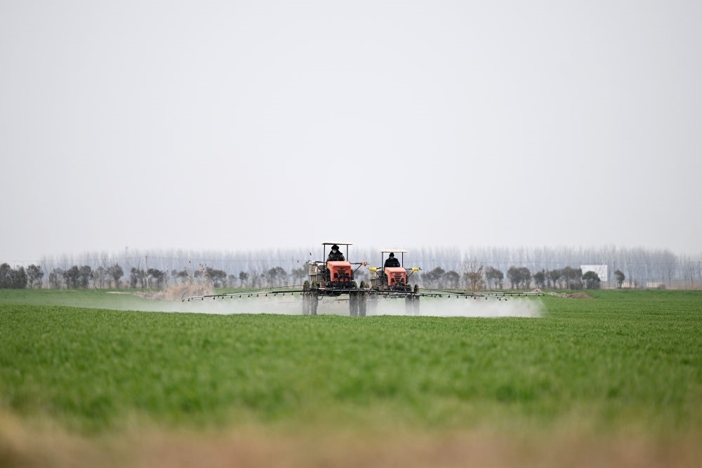 2024年3月13日,在安徽省蚌埠市五河縣頭鋪鎮(zhèn),農民駕駛農機給小麥噴灑農藥。新華社記者 黃博涵 攝