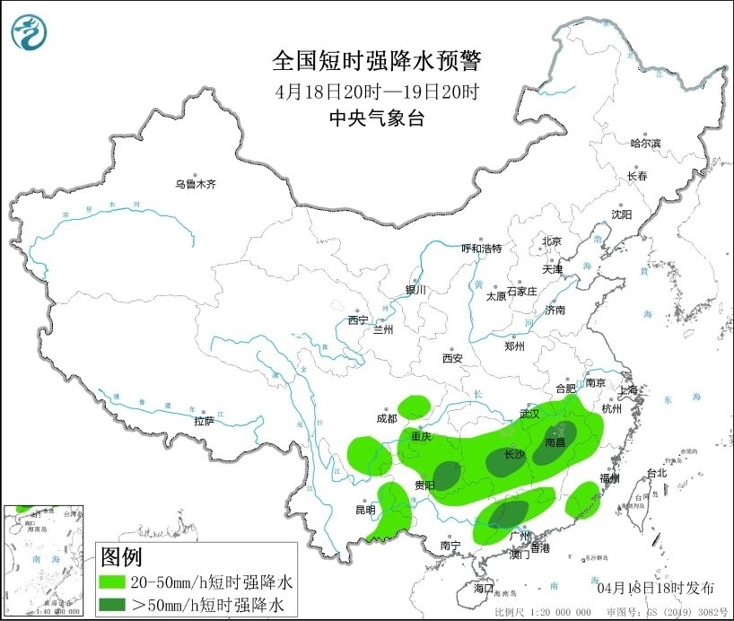 預(yù)計(jì)4月18日20時(shí)至19日20時(shí),貴州中東部、湖南中南部、江西、浙江西南部、廣西北部、廣東北部、福建南部等地的部分地區(qū)將有8-10級雷暴大風(fēng)或冰雹天氣,其中貴州東部、湖南中南部、江西中北部、廣西東北部、廣東北部等地的部分地區(qū)將有10級以上雷暴大風(fēng),局地風(fēng)力可達(dá)11級以上;四川東部和南部、重慶南部、貴州、湖北東南部、安徽南部、湖南、江西、浙江西部、福建西北部和南部、云南東南部、廣西東北部、廣東北部等地將有小時(shí)雨量大于20毫米的短時(shí)強(qiáng)降水天氣,其中貴州東部、湖南中南部、江西中部、廣東中北部等地的部分地區(qū)最大小時(shí)雨量大于50毫米,局地可達(dá)70毫米以上。