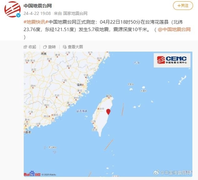 央視網(wǎng)消息:中國地震臺網(wǎng)正式測定:04月22日18時50分在臺灣花蓮縣(北緯23.76度,東經(jīng)121.51度)發(fā)生5.7級地震,震源深度10千米。