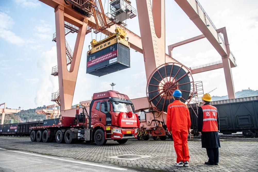 1月4日,在重慶萬州新田港站,工作人員進行集裝箱吊裝作業(yè),將專列貨物轉(zhuǎn)運至公路物流環(huán)節(jié)。新華社記者 唐奕 攝