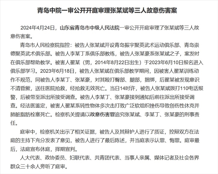 ·青島8歲男童武術(shù)俱樂部被毆打致死案4月24日開庭,將擇期判。