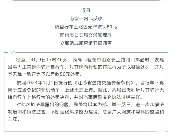 ·南京交警回應(yīng)市民騎自行車無牌被罰50元:撤銷處罰,追究民警責(zé)任。
