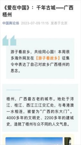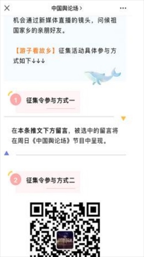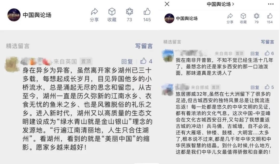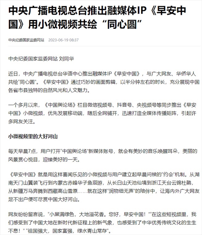 “早安中國(guó)切口新穎,有文化屬性和微記錄的氣質(zhì)?!薄懊看纹驳慕Y(jié)語字幕,都是從哪里選的?每天,都給我學(xué)習(xí)的機(jī)會(huì)?!薄皩I(yè)微記錄是媒體融合最寬廣的路?!薄对绨仓袊?guó)》真真切切地緩解了許多海內(nèi)外網(wǎng)友的故土思鄉(xiāng)情切,也收到了來自四面八方的認(rèn)可及反饋?!吨袊?guó)輿論場(chǎng)》節(jié)目持續(xù)發(fā)出“游子看故鄉(xiāng)”征集令,請(qǐng)海外華僑華人說出對(duì)家鄉(xiāng)的思念和心中最想“打卡”的祖國(guó)美景。