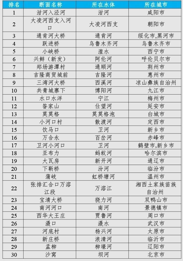 咸陽(yáng)市泔河入涇河、朝陽(yáng)市大凌河西支入河口和綏化市/黑河市通肯河大橋等30個(gè)國(guó)家地表水考核斷面水環(huán)境質(zhì)量變化情況相對(duì)較好(從第1名至第30名),渭南市裕西、天津市新老米店閘和玉溪市化念水庫(kù)等30個(gè)國(guó)家地表水考核斷面水環(huán)境質(zhì)量變化情況相對(duì)較差(從倒數(shù)第1名至倒數(shù)第30名)。
