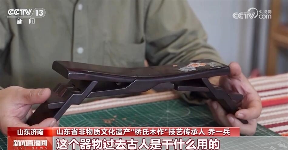 山東省非物質(zhì)文化遺產(chǎn)“橋氏木作”技藝傳承人喬一兵介紹:“它本身是一整塊木頭六個面,通過鋸和鑿形成一個器物。這個器物過去古人是干什么用的?當枕頭用的,也可以當?shù)首佑?,它最大的特點是可以折疊,攜帶非常方便,傳說是魯班發(fā)明的。和眾多的優(yōu)秀的傳統(tǒng)技藝一樣,它深層次代表的是中國的一些思想、一些哲學、一些文化在里邊,魯班枕的核心是平衡和和諧,我覺得我很有必要把它傳承下來,發(fā)揚光大?!?/p>