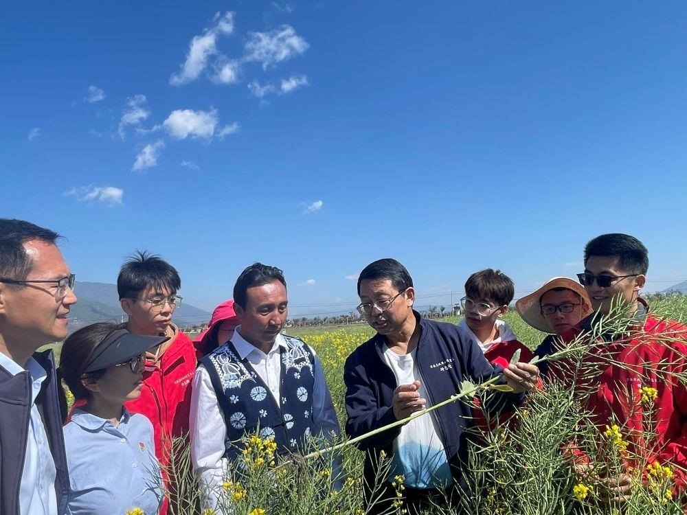 中國農(nóng)業(yè)大學(xué)教授張福鎖(右四)帶領(lǐng)科技小院師生與農(nóng)戶交流種植心得。