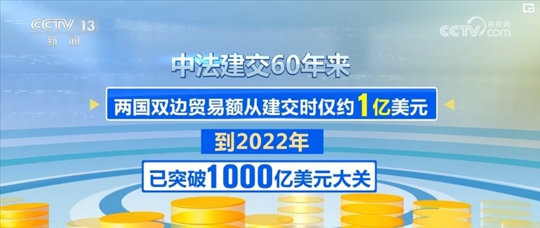 中法建交60年來,兩國雙邊貿(mào)易額從建交時僅約1億美元,到2022年已突破1000億美元大關。如今,法國是中國在歐盟內(nèi)第三大貿(mào)易伙伴和第三大實際投資來源國,中國則是法國在亞洲第一大貿(mào)易伙伴。