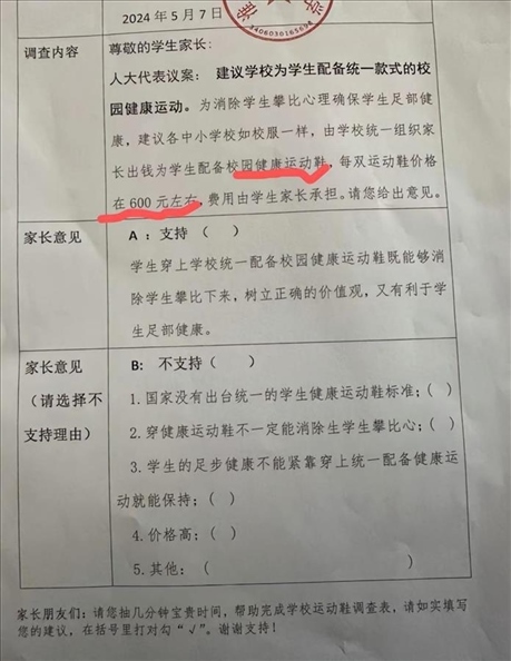 ·學(xué)校發(fā)調(diào)查表詢問家長“是否支持統(tǒng)一購置約600元一雙的運(yùn)動(dòng)鞋”,淮北市教育局澄清:只是采集信息,沒其他意圖。