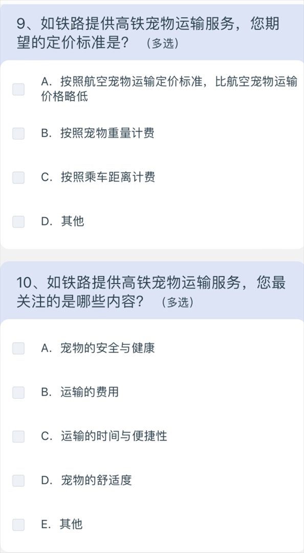問(wèn)卷涉及寵物運(yùn)輸服務(wù)定價(jià)、非養(yǎng)寵人士建議等