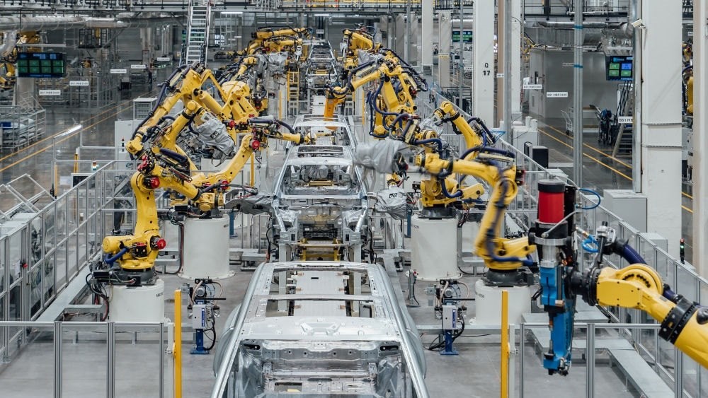 這是在重慶市兩江新區(qū)拍攝的賽力斯汽車(chē)超級(jí)工廠焊裝車(chē)間生產(chǎn)線(2024年2月26日攝,無(wú)人機(jī)照片) 新華社發(fā)(高彰 攝)。