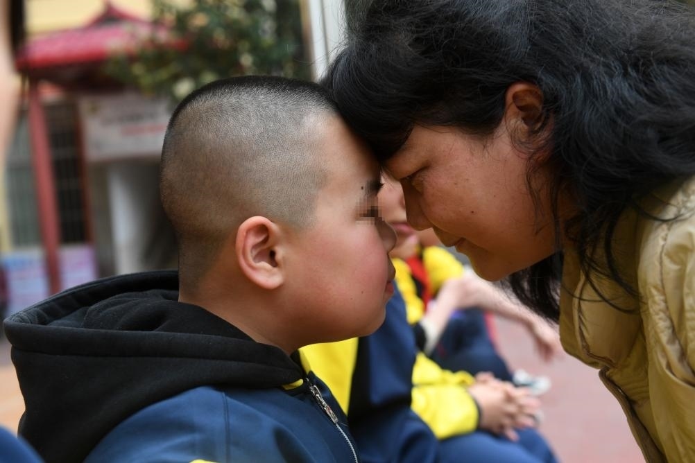 ?↑在廣西南寧高新區(qū)龍華學(xué)校,何冬艷和她照顧的孤獨(dú)癥學(xué)生在一起(2023年3月31日攝)。