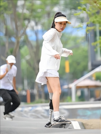 ?下圖為2023年6月20日,胡月在成都市錦江區(qū)輕極限運(yùn)動(dòng)公園練習(xí)滑板。(新華社記者 王曦 攝)