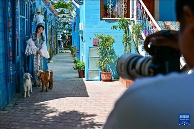 在伊犁哈薩克自治州伊寧市六星街,游客體驗旅拍項目。