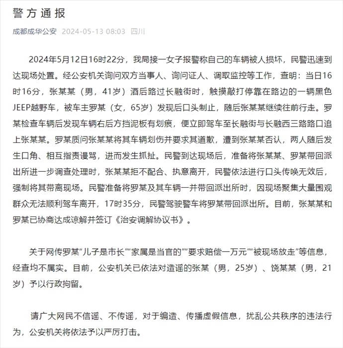 ·女子要求“觸摸”其車男子賠1萬并叫囂“兒子是市長”?成都警方:均不屬實,造謠者已被行拘。
