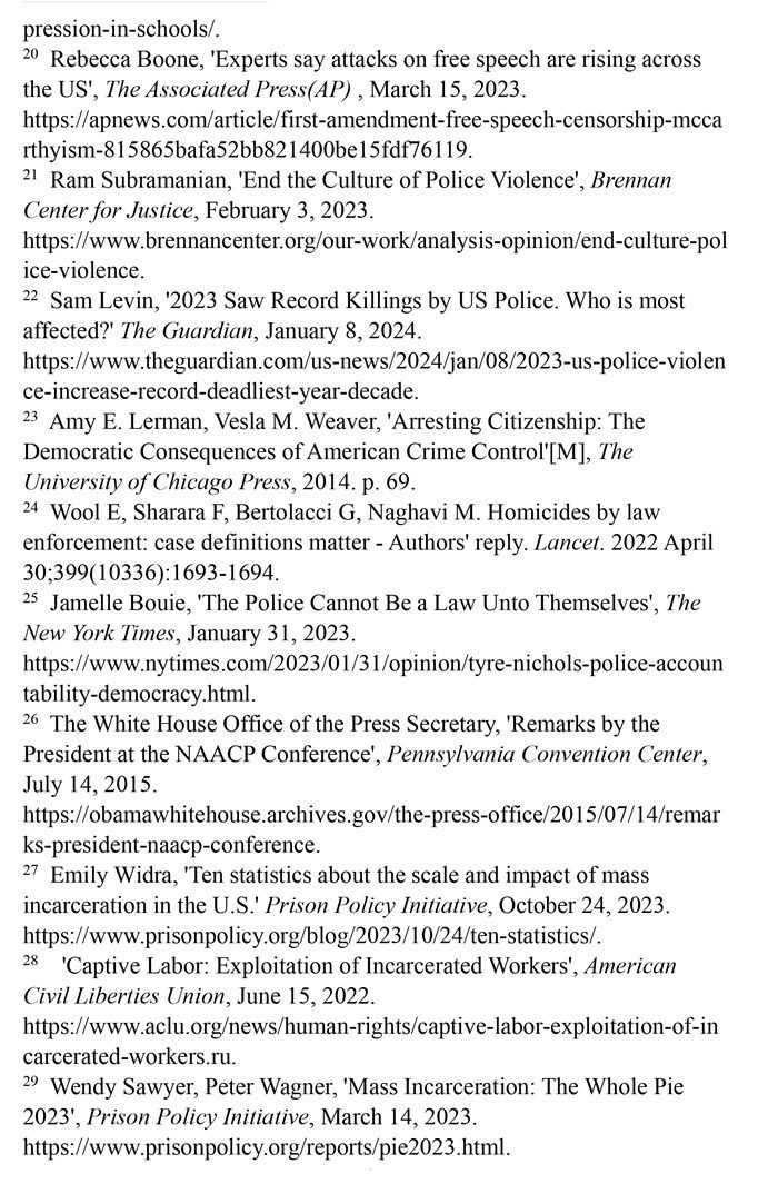 非洲裔在執(zhí)法領(lǐng)域面臨嚴(yán)重種族歧視。2023年1月3日,洛杉磯31歲的非洲裔男子基南·安德森涉嫌交通肇事,警方在制服他的過程中使用電擊槍擊中其6次,致其心臟病發(fā),送醫(yī)不治身亡。(注39)2023年1月7日,田納西州孟菲斯市的警察以“魯莽駕駛”為由將29歲的非洲裔男子泰爾·尼科爾斯攔下,并對(duì)其進(jìn)行長達(dá)數(shù)分鐘的殘忍毆打。三天后尼科爾斯因傷勢(shì)過重去世,而事后的調(diào)查無法證實(shí)警察關(guān)于其“魯莽駕駛”的說法。(注40)這兩起非洲裔遭受警察暴力執(zhí)法身亡案例引發(fā)多名聯(lián)合國專家的高度關(guān)注。專家們強(qiáng)調(diào),在兩起事件中,警察使用的武力違反保護(hù)生命權(quán),禁止酷刑和其他殘忍、不人道或有辱人格待遇或處罰的國際準(zhǔn)則,也不符合聯(lián)合國《執(zhí)法人員行為守則》和《執(zhí)法人員使用武力和火器的基本原則》。(注41)聯(lián)合國人權(quán)理事會(huì)在執(zhí)法工作中推進(jìn)種族正義和平等的國際獨(dú)立專家機(jī)制在對(duì)美國實(shí)地訪問后發(fā)布報(bào)告指出,針對(duì)非洲裔的系統(tǒng)性種族主義已經(jīng)滲透到美國警察隊(duì)伍和刑事司法系統(tǒng)。非洲裔被警察殺害的可能性是白人的3倍,被監(jiān)禁的可能性是白人的4.5倍。在每年1000多起警察殺人案件中,只有1%的涉事警察被指控。報(bào)告警告說,美國如果不按照國際標(biāo)準(zhǔn)改革警察使用武力的規(guī)則,許多殺戮將繼續(xù)發(fā)生。(注42)