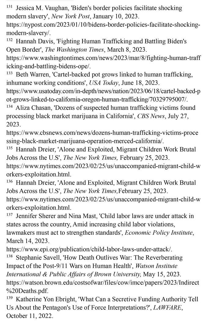 邊境政策助長現(xiàn)代奴隸制。美國政府的邊境政策加劇人口販運(yùn)問題。被遺棄在邊境州城鎮(zhèn)或被運(yùn)往全國各地的移民,往往處于孤立無援境地,最容易受到剝削和販運(yùn)。那些非法越境后聚集在擁擠、缺乏監(jiān)管的庇護(hù)所的兒童也成為人口販子的獵物。(注131)在美國被販運(yùn)的人中,72%是移民,其中大部分是通過偷渡入境,人口販運(yùn)的受害者多是婦女和兒童。打擊販賣婦女聯(lián)盟的一項(xiàng)研究估計(jì),60%的越境無人陪伴移民兒童被犯罪集團(tuán)強(qiáng)迫從事兒童色情甚至販毒活動(dòng)。(注132)《今日美國報(bào)》網(wǎng)站2023年6月18日?qǐng)?bào)道,移民被販毒集團(tuán)誘騙到加利福尼亞州北部和俄勒岡州南部的農(nóng)場(chǎng)從事大麻種植,遭受奴役和強(qiáng)迫勞動(dòng)。被販賣的移民在大麻農(nóng)場(chǎng)遭持槍恐嚇,每天被迫工作16個(gè)小時(shí)甚至更長時(shí)間,有時(shí)連飯都吃不上。移民婦女遭到性侵犯,有些人被謀殺,尸體被丟棄在荒野中。(注133)美國哥倫比亞廣播公司新聞網(wǎng)2023年7月27日?qǐng)?bào)道,近60名遭人口販運(yùn)的受害者被偷運(yùn)到加利福尼亞中部的一個(gè)非法大麻種植場(chǎng)所,被強(qiáng)迫加工大麻,向偷運(yùn)者償還債務(wù)。(注134)