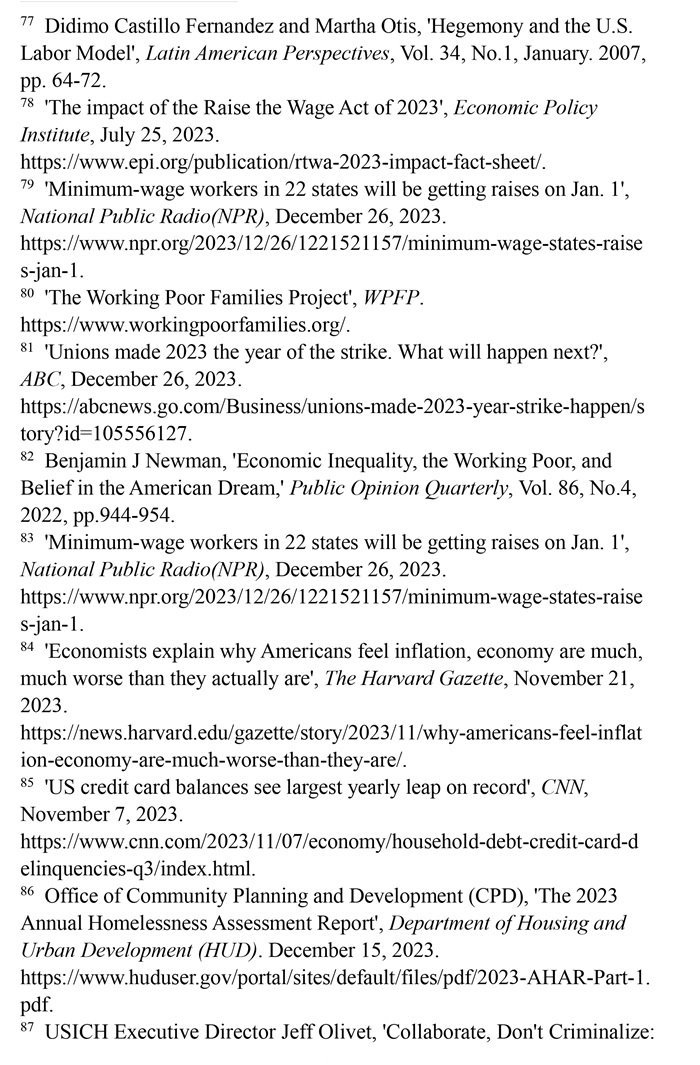 “工作者貧困”問題突出。美國勞動(dòng)力市場(chǎng)狀況發(fā)生了結(jié)構(gòu)性變化,低薪崗位和缺乏監(jiān)管普遍存在。(注77)有大批“工作窮人”終日勞作,其工資水平卻難以維持基本生計(jì),還缺乏應(yīng)有的社會(huì)保障。美國聯(lián)邦最低時(shí)薪標(biāo)準(zhǔn)自2009年以來一直沒有上調(diào)。(注78)美國勞工部的數(shù)據(jù)顯示,2023年仍有20個(gè)州維持聯(lián)邦最低時(shí)薪標(biāo)準(zhǔn)。(注79)美國有1150萬個(gè)低收入工薪家庭,包括1480萬兒童在內(nèi)的2990多萬美國人生活在這些低收入工薪家庭。(注80)勞資收入增長懸殊導(dǎo)致多行業(yè)大面積罷工。2023年,美國發(fā)生了21世紀(jì)以來波及范圍最廣的罷工潮,包括影視、制造、醫(yī)療、媒體在內(nèi)的多個(gè)行業(yè)都出現(xiàn)大規(guī)模罷工。(注81)加利福尼亞州大學(xué)公共政策與政治學(xué)院副教授本杰明·紐曼評(píng)論稱,陷入結(jié)構(gòu)性貧困之中的“工作窮人”既缺乏機(jī)會(huì)平等,也難以向上流動(dòng),他們極大地降低了對(duì)“美國夢(mèng)”的信念。(注82)