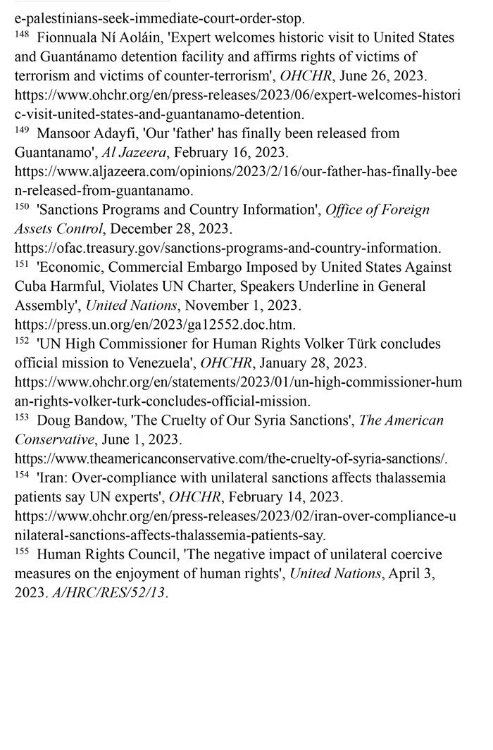 長期濫施單邊制裁造成嚴(yán)重人道主義后果。自1950年以來,美國使用的制裁次數(shù)居全球之首。根據(jù)美國財(cái)政部2023年12月28日公布的數(shù)據(jù),美國制裁的國家超過20個(gè)。(注150)第78屆聯(lián)合國大會(huì)發(fā)言人2023年11月1日指出,美國對(duì)古巴實(shí)施的經(jīng)濟(jì)、商業(yè)和金融封鎖違反了《聯(lián)合國憲章》,對(duì)古巴人民造成了毀滅性影響。(注151)聯(lián)合國大會(huì)2023年11月2日通過決議,再次敦促美國終止對(duì)古巴長達(dá)60多年的經(jīng)濟(jì)、商業(yè)和金融封鎖,這是聯(lián)合國大會(huì)連續(xù)第31年通過類似決議。2023年1月28日,聯(lián)合國人權(quán)事務(wù)高級(jí)專員沃爾克·圖爾克在訪問委內(nèi)瑞拉后表示,2017年以來美國施加的制裁加劇了委內(nèi)瑞拉的經(jīng)濟(jì)危機(jī),嚴(yán)重阻礙人權(quán)的實(shí)現(xiàn)。(注152)“美國保守派”網(wǎng)站2023年6月1日?qǐng)?bào)道,美國制裁進(jìn)一步加劇了敘利亞人民的貧困。敘利亞70%的人口面臨食物短缺,其中1200萬人三餐不繼,290萬人食不果腹。(注153)聯(lián)合國人權(quán)理事會(huì)單邊強(qiáng)制措施對(duì)人權(quán)負(fù)面影響問題特別報(bào)告員阿萊娜·杜晗2023年2月14日指出,美國對(duì)伊朗的制裁減少了地中海貧血癥患者從國外進(jìn)口救命藥物的機(jī)會(huì),導(dǎo)致伊朗患者的并發(fā)癥和死亡率增加,是對(duì)健康權(quán)的侵犯。(注154)聯(lián)合國人權(quán)理事會(huì)2023年4月3日通過決議指出,單邊強(qiáng)制性措施會(huì)對(duì)目標(biāo)國家廣大民眾的人權(quán)產(chǎn)生深遠(yuǎn)影響,對(duì)窮人和處境最脆弱的人影響尤為嚴(yán)重。決議譴責(zé)某些大國繼續(xù)單方面適用單邊強(qiáng)制性措施。美國在該決議表決中投了反對(duì)票。(注155)