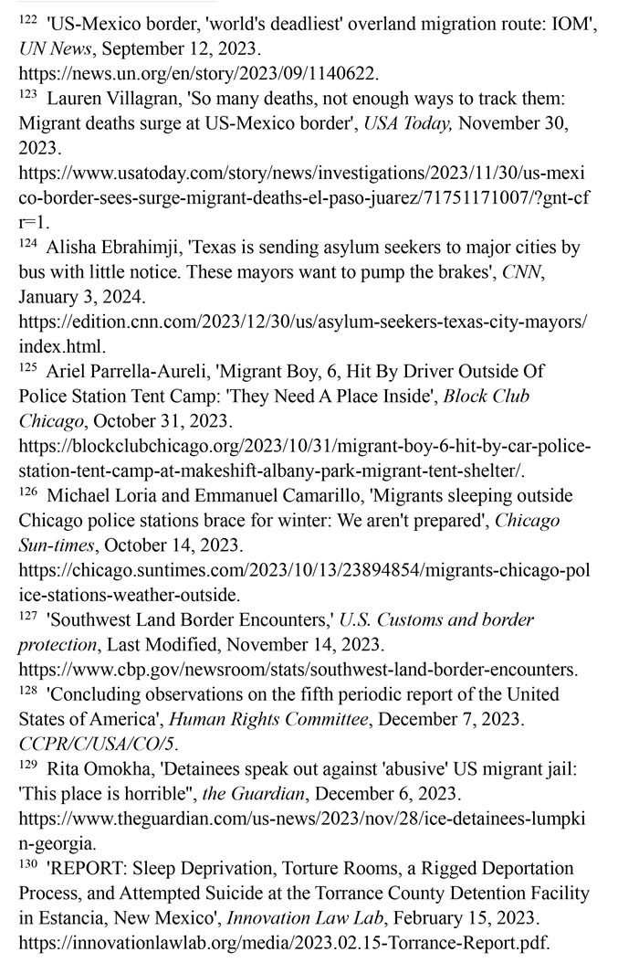 入境移民遭受酷刑及其他不人道待遇。2023財(cái)年,在美國南部邊境遭逮捕或驅(qū)逐的移民總數(shù)達(dá)240多萬人,再創(chuàng)歷史新高。(注127)聯(lián)合國人權(quán)事務(wù)委員會(huì)對(duì)移民在美國受到長時(shí)間的拘留表示擔(dān)憂,批評(píng)美國的拘留所條件惡劣,人滿為患,被拘押者無法獲得食物、水和醫(yī)療服務(wù),導(dǎo)致包括兒童在內(nèi)的許多人死亡;公共和私營移民拘留設(shè)施存在性暴力、長期單獨(dú)監(jiān)禁、虐待等侵犯人權(quán)問題。(注128)英國《衛(wèi)報(bào)》網(wǎng)站2023年12月6日?qǐng)?bào)道,由美國私人監(jiān)獄公司CoreCivic運(yùn)營的、位于佐治亞州蘭普金的斯圖爾特拘留中心存在長期單獨(dú)監(jiān)禁、性虐待、醫(yī)療疏忽以及強(qiáng)迫勞動(dòng)等令人擔(dān)憂的問題。(注129)創(chuàng)新法律實(shí)驗(yàn)室于2023年2月15日發(fā)布報(bào)告揭露,由CoreCivic運(yùn)營的、位于新墨西哥州埃斯坦西亞的托蘭斯縣拘留所存在對(duì)被關(guān)押者實(shí)施酷刑現(xiàn)象。在夜間,每隔15分鐘就會(huì)有一名警衛(wèi)開著收音機(jī)的最大音量走過這些房間,大聲地敲著門,并用手電筒強(qiáng)光照進(jìn)房間,吵醒任何可能睡著的人。在寒冷的天氣里,每個(gè)房間的通風(fēng)管道整夜都在吹冷空氣。一些人試圖用衛(wèi)生紙或毯子蓋住通風(fēng)口,但警衛(wèi)們拿走了用來阻擋冷空氣的任何東西。這些牢房里,廁所污水和糞便溢出,人們被迫睡在臭氣熏天的地板上。(注130)