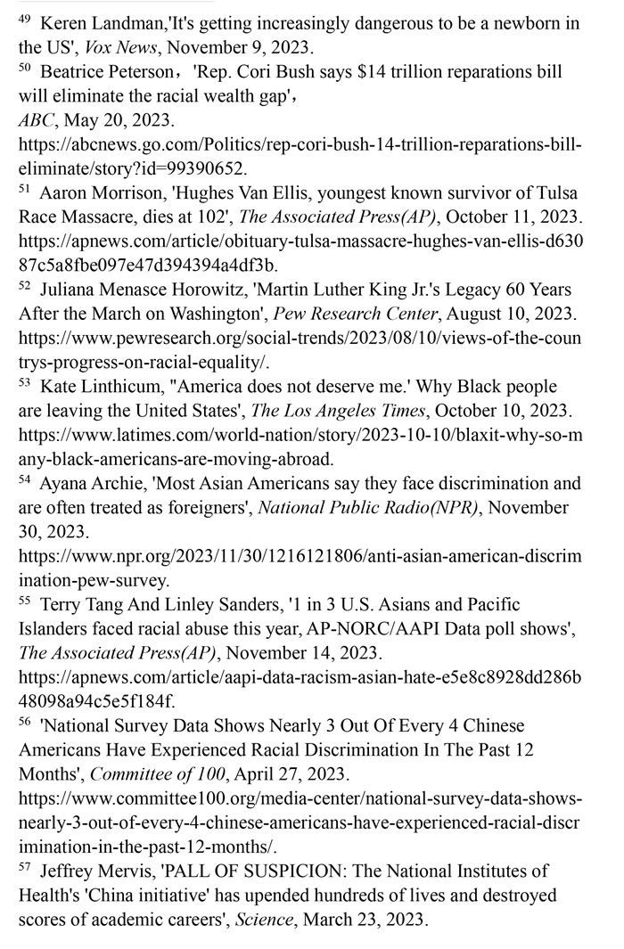 對(duì)非洲裔種族迫害的賠償遙遙無期。美國南北戰(zhàn)爭(zhēng)結(jié)束不久后,美國政府承諾向曾被奴役的每一個(gè)非洲裔家庭進(jìn)行賠償,但一百多年來這一承諾從未兌現(xiàn)。1989年,美國眾議院非洲裔議員約翰·科尼爾斯提出“研究和制定非洲裔美國人賠償提案委員會(huì)法案”(H.R.40法案),但這一法案數(shù)十年來從未進(jìn)入過國會(huì)表決程序。(注50)1921年,美國俄克拉何馬州塔爾薩地區(qū)發(fā)生針對(duì)非洲裔的種族屠殺事件,導(dǎo)致數(shù)百人遇害。為塔爾薩大屠殺最后3位已知幸存者爭(zhēng)取賠償?shù)脑V訟仍未定案,而其中年齡最低的幸存者休斯·范·埃利斯已于2023年10月去世。(注51)皮尤研究中心2023年8月10日發(fā)表的報(bào)告顯示,83%的非洲裔美國人表示,美國政府所做的確保平等的努力還遠(yuǎn)遠(yuǎn)不夠。(注52)許多不滿美國政治和種族歧視的非洲裔選擇離開。離開美國的非洲裔在葡萄牙、加納、哥倫比亞和墨西哥等地建立了新的社區(qū),這已然成為一種名為“Blaxit”的潮流(“Black”和“exit”的結(jié)合),并在社交媒體上廣泛流傳。他們高呼:“美國配不上我!”(注53)