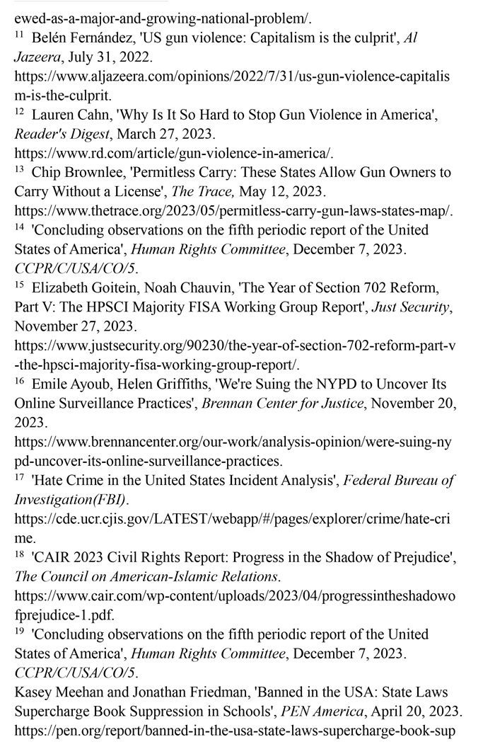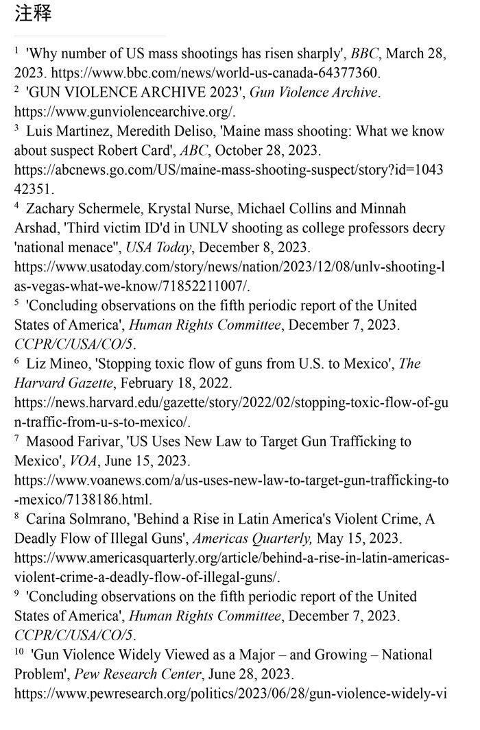 槍支暴力造成慘痛生命代價(jià)。數(shù)據(jù)顯示,美國所有類型的槍支暴力事件都呈上升趨勢(shì)。(注1)根據(jù)“槍支暴力檔案”網(wǎng)站統(tǒng)計(jì)的數(shù)據(jù),2023年美國至少發(fā)生了654起大規(guī)模槍擊事件。槍支暴力導(dǎo)致近4.3萬人死亡,平均每天死亡117人。(注2)例如,美國廣播公司新聞網(wǎng)站2023年10月28日?qǐng)?bào)道,緬因州發(fā)生大規(guī)模槍擊事件,造成至少18人死亡,13人受傷。(注3)《今日美國報(bào)》網(wǎng)站2023年12月6日?qǐng)?bào)道,拉斯維加斯3名大學(xué)教授被一名前同事槍殺。美國大學(xué)教授協(xié)會(huì)主席艾琳·馬爾維稱,槍支暴力是“不可接受的國家威脅”,敦促美國政府進(jìn)行槍支政策改革。(注4)美國與槍支有關(guān)的傷亡人數(shù)激增,引發(fā)聯(lián)合國人權(quán)事務(wù)委員會(huì)的嚴(yán)重關(guān)切。(注5)
