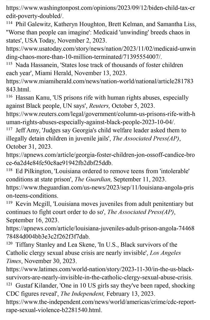 兒童貧困人口激增。美國人口普查局2023年9月發(fā)布的報(bào)告顯示,2022年美國貧困人口激增(注112),又有500多萬兒童陷入貧困,兒童貧困率翻了一番多。這是有記錄以來,兒童貧困人口的最大年度增幅。其中一個(gè)重要原因是美國政府取消了兒童稅收抵免計(jì)劃,使兒童再次陷入貧困。(注113)